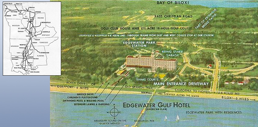 For almost 50 years, tourists flocked to the Edgewater Gulf Resort while the community of Edgewater Park grew up around it. The "Magnolia Road" brought motoring tourists from Illinois, Indiana, Wisconsin, Iowa and Minnesota while the "Magnolia Express" trains connected the midwest to New Orleans and the ornate train station built at the Resort.