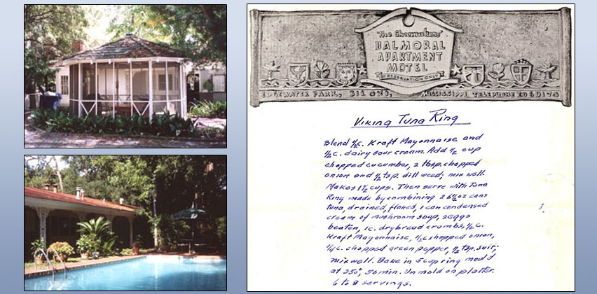 A.P. Shoemaker became the hotel manager for the Edgewater Gulf Resort in the mid 1940's and built the house at 120 Balmoral Avenue in 1946 so he could walk to work. In 1958, he built the ten rental units, the pool, playground and Gazebo. The Gazebo has the same Italian tiles as the Resort. Despite two major hurricanes (Camille and Katrina), these survive today.